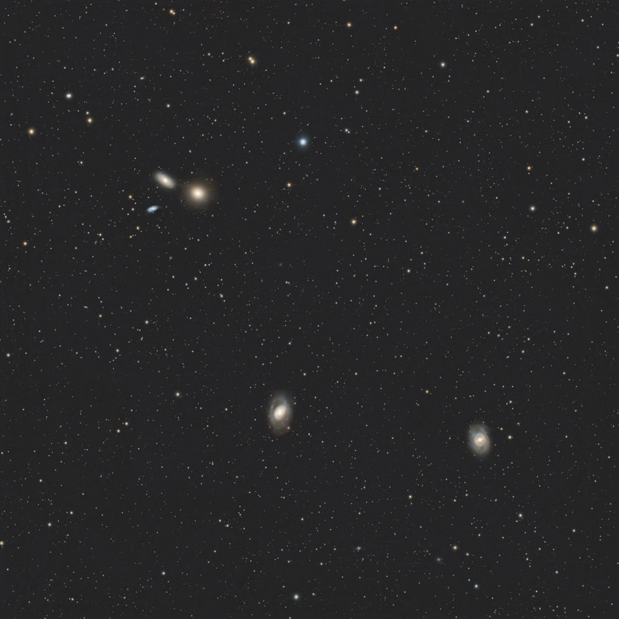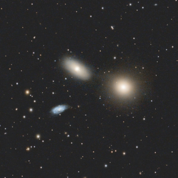 3つの銀河が近接していると言えば、同じしし座にある「しし座のトリオ」ことM65、M66、NGC3628が有名で、こちらは明るさ、大きさ、密集度いずれも劣るため、人気はいま一つのようです。しかし、それぞれの銀河を見るとどれも個性的な姿で、もっと人気が出ても良さそうなものです。