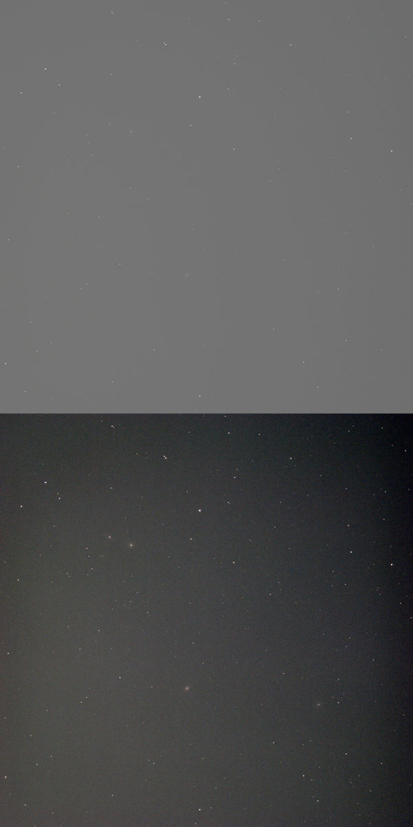 コンポジット&処理前の画像およびレベル調整のみ行った画像です。今回の撮影では光害カットフィルターを挟んでいないこともあり、猛烈にカブっていて銀河の写りもかなり頼りないです。それでも最終的な仕上がりはああなるのですから、ソフトの力は大したものです。
