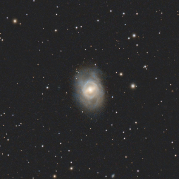 M95は、中心部の棒構造とそれを取り囲むリング状の星形成領域、その外側に伸びる淡い腕が特徴的な、棒渦巻銀河です。地球からの距離はおよそ3300万光年。渦がほぼ完全にこちらを向いている「フェイスオン」の銀河なので構造がよく分かり、写真だとまるで目玉のようです。